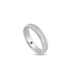 The Romantic Blue wedding band, crafted from Platinum (PT950) and adorned with three diamonds symbolizing the past, present, and future, celebrates enduring love. Its blue sapphire inner lining signifies loyalty, presenting a captivating and cohesive design that beautifully represents your shared journey.